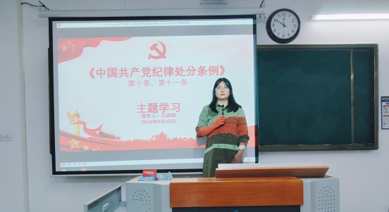 为深入学习贯彻习近平总书记关于党纪学习教育的重要讲话指示精神,学习领会新修订的《中国共产党纪律处分条例》和《中国共产党廉洁自律条例》及《中国共产党问责条例》,增强党员的纪律意识,强化正风肃纪。2024年5月15日,永利集团3044欢迎你经济学管理学学生党支部于一教219进行专题学习。会议由管理学党支部书记石园园领学,经济学、管理学学生党支部正式党员和预备党员以及经济学、管理学外出实习党员线上全员参加。