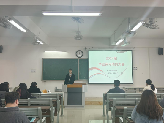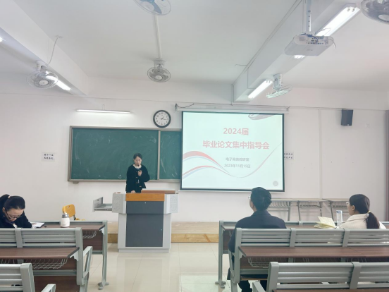 为推进2024届电子商务专业实习工作的顺利开展,确保学生毕业论文的写作质量,引导学生做好实习前的各项准备工作,使同学们更加明确毕业实习的目的、意义和任务,同时让学生认真规范书写毕业论文,强化思想认识。在学院的统一部署和安排下,电子商务教研室于2023年11月15日下午13:00在一教521召开2024届毕业实习动员大会暨毕业论文集中指导会。参加本次会议的有院长助理张珊、电子商务教研室负责人李婉、电子商务专业全体实习及论文指导老师、2024届电子商务专业全体毕业生,会议由李婉主持。