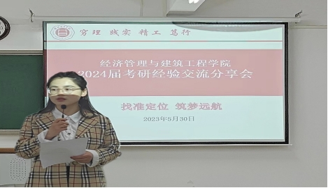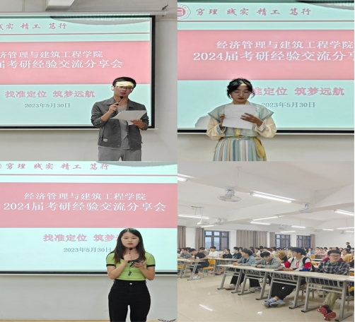 随着2023届全国研究生招生考试落下帷幕,2024届考研紧随其后,为传承永利官网首届毕业生考研文化精神,激发学生考研的热情,加强学生对考研的认识和了解,明确考研规划,挖掘自身潜能,树立考研必胜的自信,营造浓厚考研氛围,学院特邀2023年考研成功上岸的四位学生为学院各专业学生做考研经验交流分享。5月30日晚在2教323教室召开了经济管理与建筑工程学院首届考研经验分享交流会,学院书记助理叶赵强,考研成功上岸学生21级物流管理专业李晴、经济学专业黄顺、人力资源管理专业张梦茹、电子商务专业裘功浩,以及学院大一、大二和大三有考研意向学生参加此次会议,会议由22级辅导员张雨停主持。