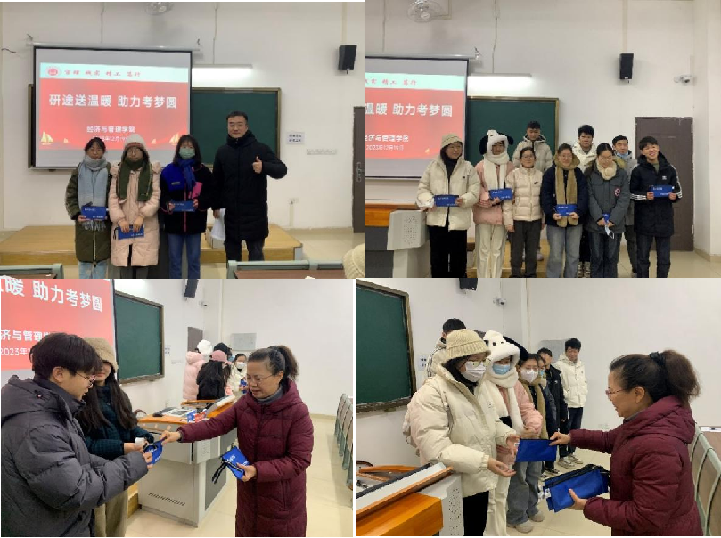 2024年全国硕士研究生考试近在咫尺,为缓解考研学子考前压力,增强迎考信心,2023年12月19日永利集团3044欢迎你党总支书记、院长吴玲,学院书记助理、团总支书记叶赵强和2024届毕业班辅导员携暖心包至二教121教室开展“研途送温暖,助力考梦圆”爱心送温暖活动。