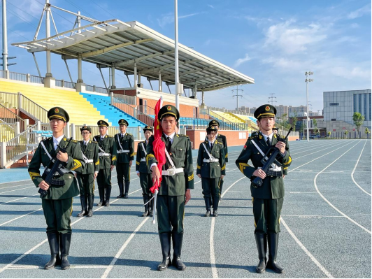 每周一的早晨,仪式在庄严的《义勇军进行曲》中拉开序幕。国旗护卫队迈着整齐划一、铿锵有力的步伐,护送着五星红旗正步走向旗杆。升国旗、唱国歌、行注目礼。师生们神情庄重,目不转睛地注视着五星红旗在熠熠晨光中冉冉升起。