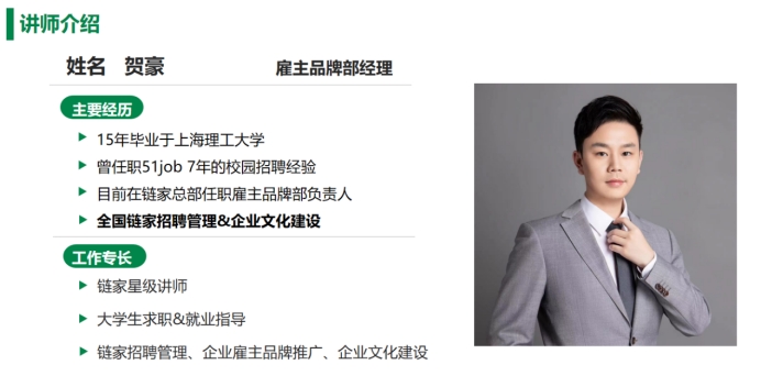 本次讲座的主讲嘉宾贺豪是负责全国链家招聘管理、企业文化建设、雇主品牌部的负责人。讲座内容分为简历制作、面试技巧两个部分。讲座伊始,贺豪从求职简历制作对同学们进行了指导。在求职简历制作方面,向同学们展示了一些优秀的和错误的简历示例,根据这些示例向同学们指出制作优秀简历的要点,并给在场同学提供了优秀简历模板。随后,在面试技巧方面,贺豪详细介绍了面试的主要流程,并认真地讲解了面试前需要做的准备工作。“自我介绍和回答问题是面试必不可少的步骤”,贺豪现场邀请了几位同学做自我介绍,并就此给同学们的自我介绍进行了分析,向同学们分享了面试押题法则——“STAR法则”和面试官追问逻辑——“BEI法则”两种方法如何准备自我介绍。
