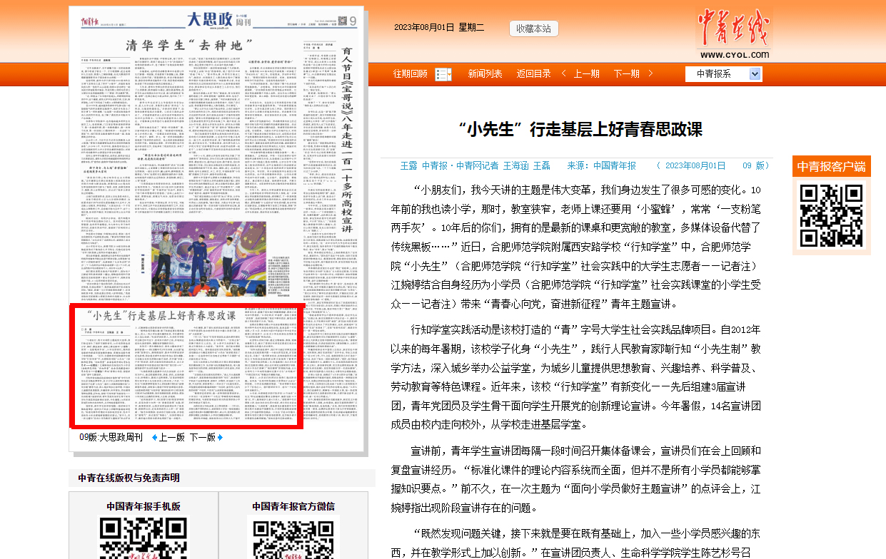 此次行知学堂是学院和首次联合桥头集镇中学开展行知学堂,小先生们与38名小学员在为期28天的实践活动中朝夕相处,共同收获了欢乐和成长,并赢得当地家长和学员们的一致好评,中国青年报对此进行了报道。(世俱杯sjb官网:周玉)