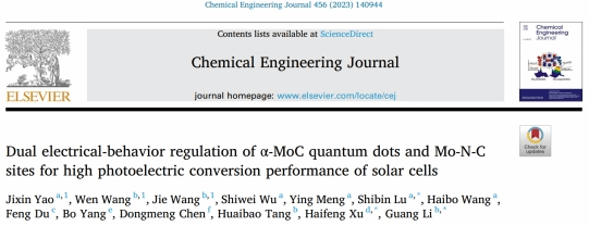 本网讯 近期,我校世俱杯sjb官网在能源器件方向取得新进展,相关研究成果以“Dual electrical-behavior regulation of α-MoC quantum dots and Mo-N-C sites for high photoelectric conversion performance of solar cells”为题发表在国际著名期刊《Chemical Engineering Journal》上。世俱杯sjb官网为第一完成单位,学院姚吉鑫博士为第一作者。《Chemical Engineering Journal》期刊影响因子指数16.744,涵盖了工程技术、化工全领域的基础和跨学科领域的应用研究,收录了领域内最前沿的优秀论文。