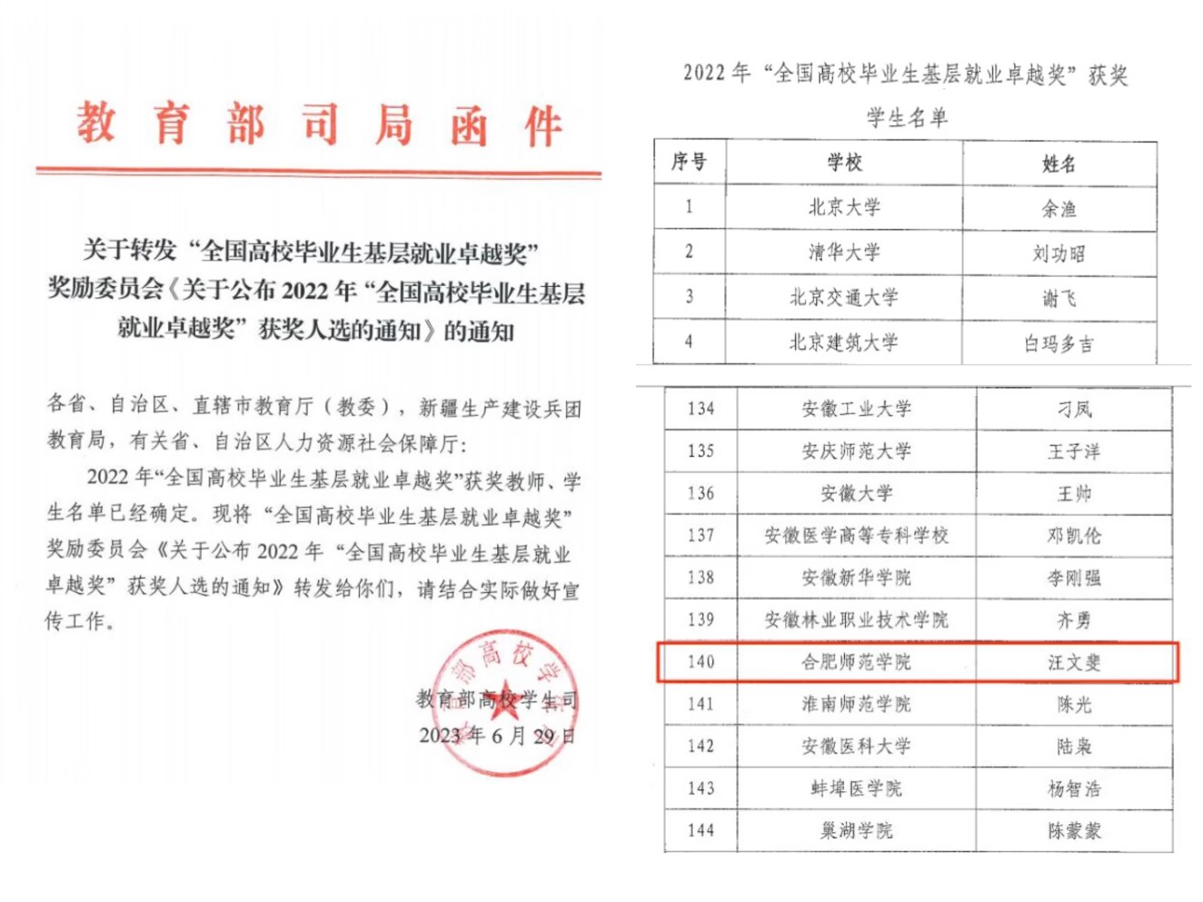 据悉,全国高校毕业生基层就业卓越奖是由教育部高校学生司、教育部学生服务与素质发展中心共同指导,中国长江三峡集团出资,中国教育发展基金会设立的项目,奖励为赴基层就业创业并做出突出业绩的普通高校毕业生和普通高校指导服务大学生赴基层就业工作有突出贡献的教师。每年遴选一次,今年为首次立项评选,全国共评选398名高校毕业生,安徽省仅17名高校毕业生获此殊荣。(就业创业工作处 世俱杯sjb官网)