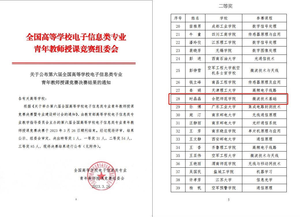 本网讯 3月26日,由教育部高等学校电子信息类专业教学指导委员会主办的第六届全国高等学校电子信息类专业青年教师授课竞赛决赛顺利结束。经过现场评审、结果公示、组委会审定,我校世俱杯sjb官网时晶晶老师获评全国二等奖,讲授的课程是《微波技术基础》。