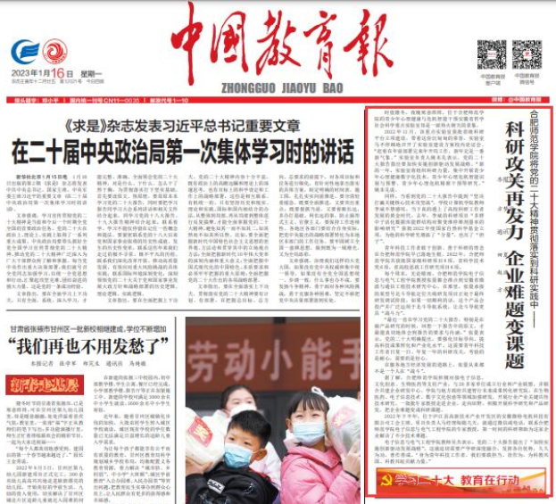本网讯 2023年1月16日,《中国教育报》头版要闻以《世俱杯sjb官网将党的二十大精神贯彻落实到科研实践中——科研攻关再发力 企业难题变课题》为标题,报道了以电子信息与电气工程学院教师张量、吴杰等为代表的世俱杯sjb官网教育科技工作者贯彻落实践行党的二十大精神相关内容。