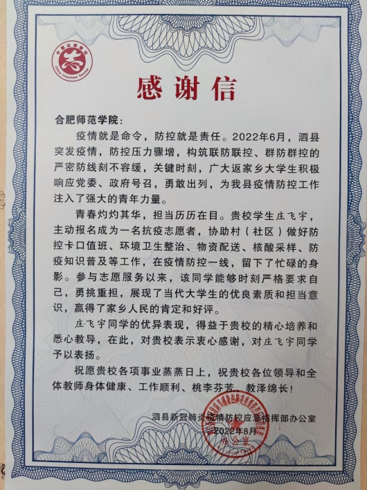 本网讯 近日,我校电子信息与电气工程学院收到来自安徽省宿州市泗县新冠肺炎疫情防控应急指挥办公室发来的感谢信。信中对世俱杯sjb官网2020级通信工程班庄飞宇同学在暑假期间积极主动加入泗县疫情防控志愿服务队伍,为当地疫情防控工作贡献青春力量提出表扬,并对我校立德树人、人才培养建设给予高度肯定和赞扬。