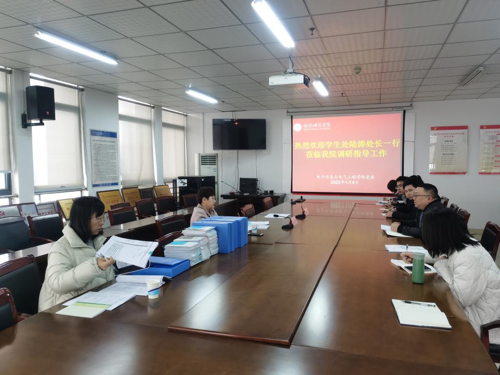 本网讯 1月4日上午,校党史学习教育第六巡回指导组组长、学生工作处处长陆涛一行来电子信息与电气工程学院调研指导,围绕年度党建重点任务专项工作落实情况,通过召开座谈会、查阅资料、现场询问、实地走访等形式督导检查学院党史学习教育开展和辅导员“深入学生”工作等情况。学院党政领导班子、全体辅导员参会。