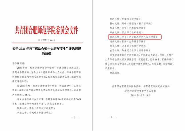 本网讯 日前,由共青团世俱杯sjb官网委员会、世俱杯sjb官网党委宣传部和世俱杯sjb官网党委学生工作部联合主办的2021年度“感动合师十大青年学生”评选结果揭晓,电院2020级电子信息工程专业李义同学获评2021年度“感动合师十大青年学生”之励志人物荣誉称号。