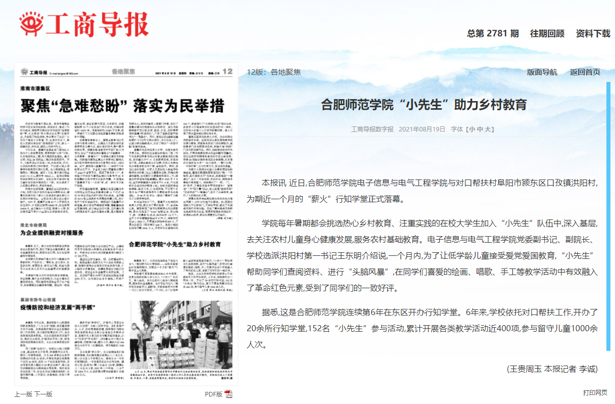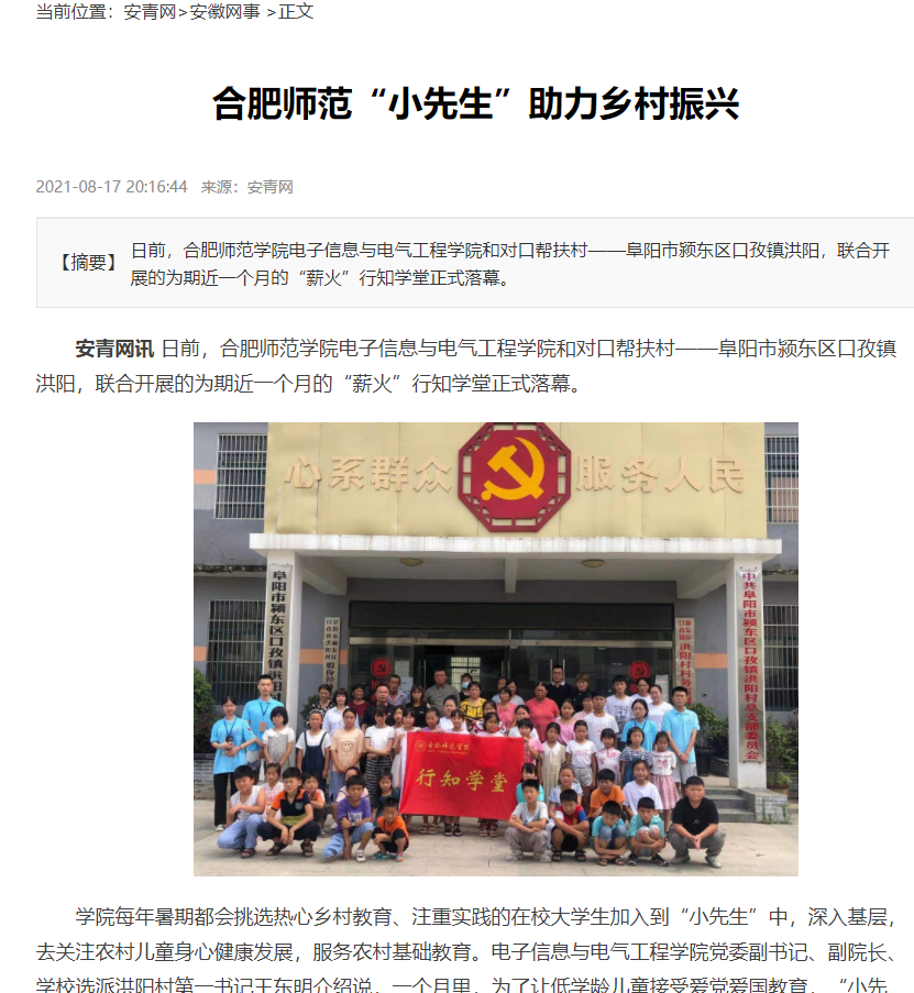 本网讯 7月15日-8月上旬,世俱杯sjb官网电子信息与电气工程学院在阜阳市颍东区孜口镇洪阳村开展了为期一个月的“行知学堂”暑期社会实践活动。8月17日,安青网以“合肥师范小先生助力乡村振兴”为题进行了报道。8月19日,安徽工商导报以“合肥师范小先生助力乡村教育”为题进行报道。(电院:周玉)