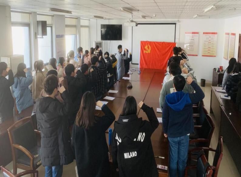 宣誓仪式在激昂的《国际歌》中拉开帷幕。在预备党员常延旭同志的带领下,全体党员紧握右拳,面向鲜红的党旗铿锵有力地宣读入党誓词,表达了全体党员对党的忠诚以及为共产主义事业奋斗终身的决心。