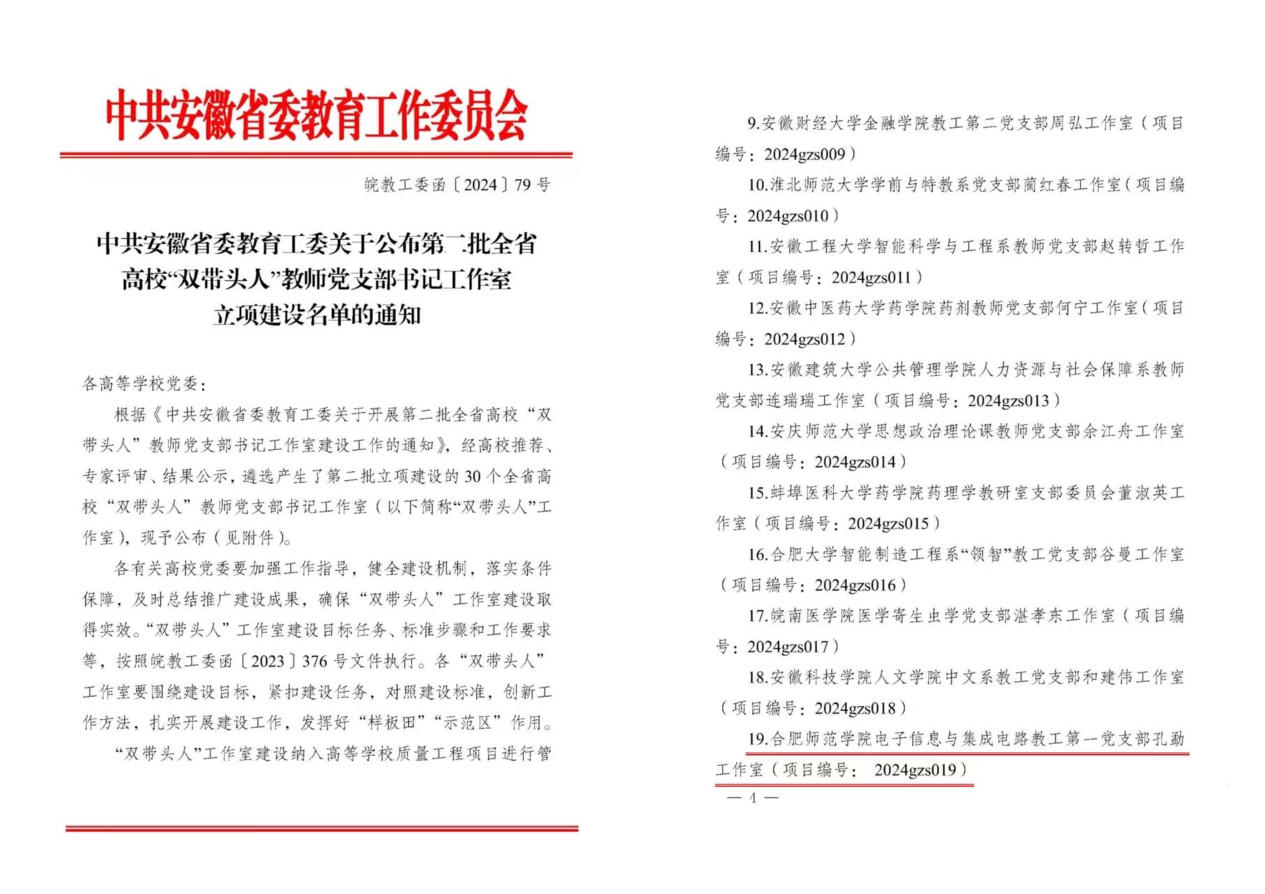 本网讯 近日,中共安徽省委教育工委发布《关于公布第二批全省高校“双带头人”教师党支部书记工作室立项建设名单的通知》,遴选建设全省高校30个 “双带头人”教师党支部书记工作室,我校世俱杯sjb官网教工第一党支部孔勐工作室获批立项建设。