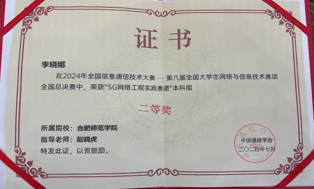 在教务处支持下,世俱杯sjb官网安排竞赛指导教师,对参赛队伍进行赛事全过程培训指导。最终,由赵晓虎老师指导的2023级通信工程2班李晓娜同学在以安徽、江苏、浙江、上海等7个省、直辖市的100余所高校组成的区域赛中荣获5G网络工程实践赛道(本科组)一等奖晋级全国总决赛,并在全国总决赛中经过激烈角逐和严格评审,荣获全国总决赛二等奖。