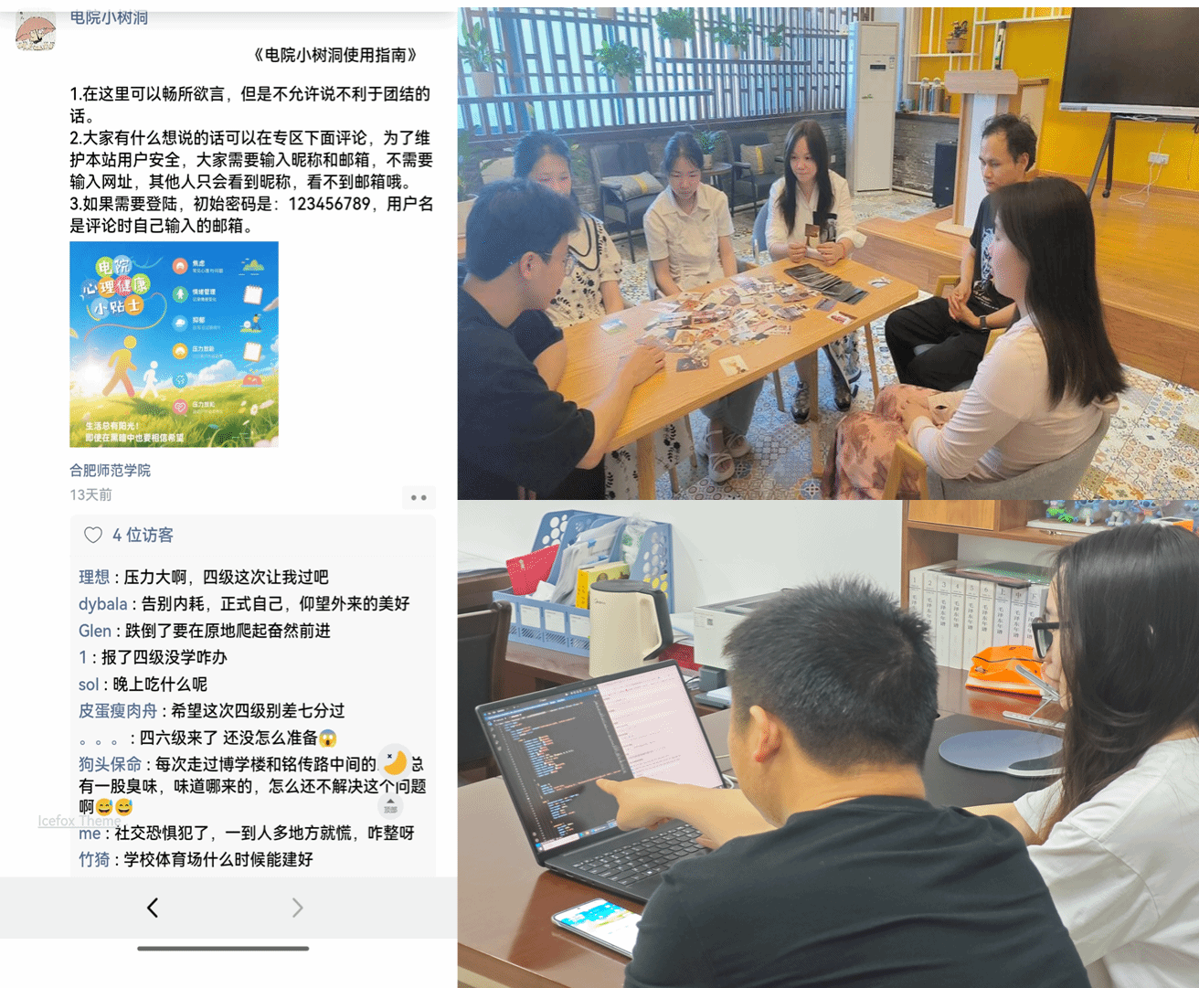 学院充分发挥学科特色,创新推出“‘芯’世界‘心’对话”心理健康教育品牌项目。5月7日至23日,OH卡心理沙龙活动在学院两个校区里陆续举办,活动由国家二级心理咨询师、辅导员周玉和辅导员耿洪宝共同指导开展,累计吸引百余名学生参与。同时,以“你的心事值得被听见”为主题,依托学院专业背景,将编程技能与心理健康教育深度融合,学院学生精心开发了“电院小树洞”心理互助平台,以创新形式为师生搭建起心灵沟通的桥梁,获得广泛好评。