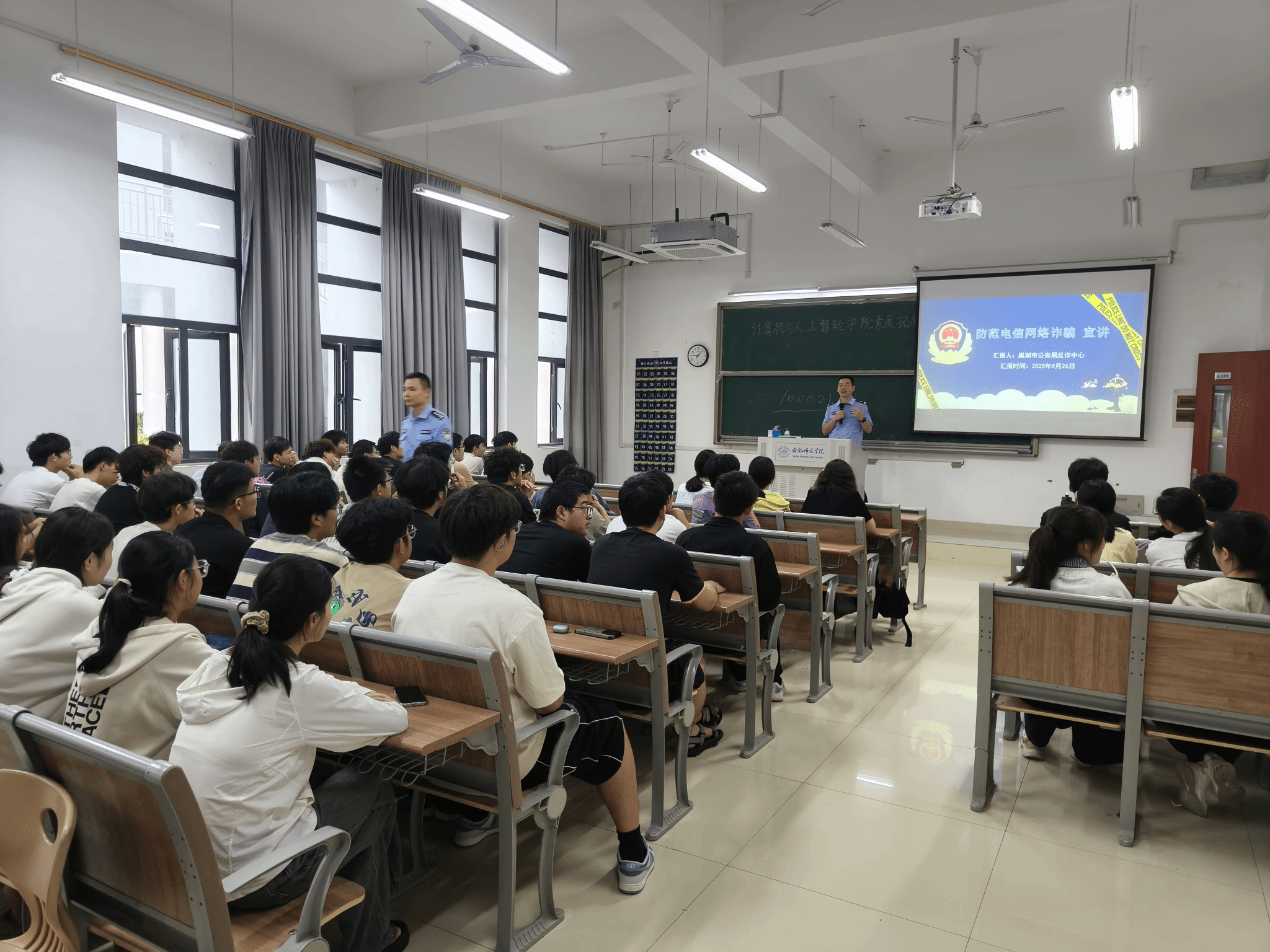 为进一步增强在校大学生防范电信网络诈骗的意识和能力,筑牢校园安全防线。2025年9月26日上午9时,一场以“防范电信网络诈骗”为主题的反诈安全教育主题宣讲在世俱杯sjb官网滨湖校区博学楼A106教室召开。本次活动由学校保卫处牵头,世俱杯sjb官网组织,特邀巢湖市公安局反诈中心警官担任主讲,为同学们带来了一堂生动的反诈知识普及课。