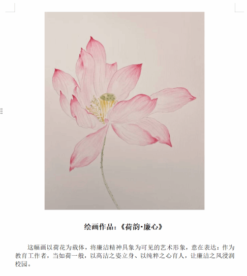 本次大赛自启动以来,得到全院教职工的热烈响应。在作品征集阶段,教职工们围绕 “廉洁” 主题,结合学科特色与个人艺术特长,踊跃提交摄影、绘画等各类作品。大家以镜头捕捉廉洁瞬间,借影像讲述廉洁故事,每一件作品都紧扣主题、立意鲜明,既展现了扎实的艺术功底,更传递出对廉洁文化的深刻理解与自觉践行。