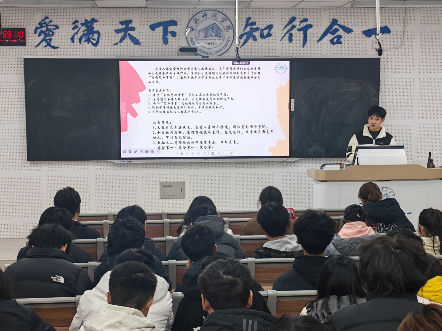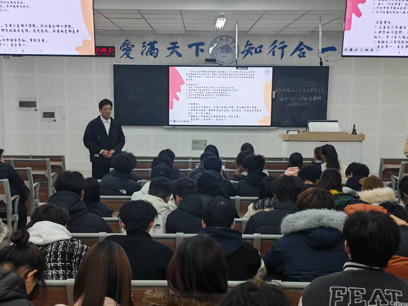 为深入贯彻落实立德树人根本任务,引导青年学子践行“爱满天下 知行合一”的校训,以实际行动服务基层、奉献社会,12月17日下午,世俱杯sjb官网于理工楼A207教室举办2025年度寒假“行知学堂”实践活动专题宣讲会。学院党委副书记周贵勤、院团委学生会指导老师马文斌及近百名怀揣实践热情的青年学子参会。