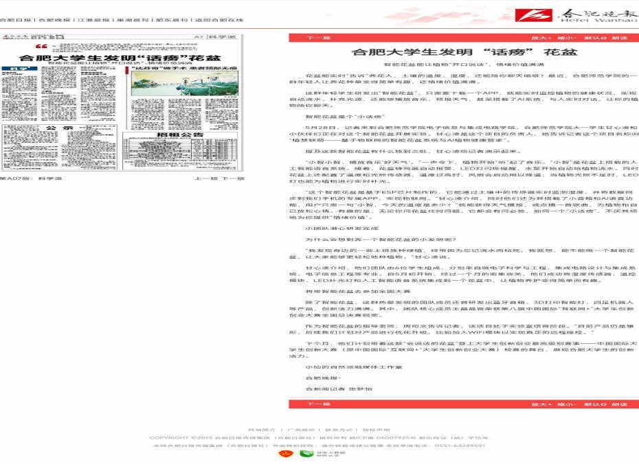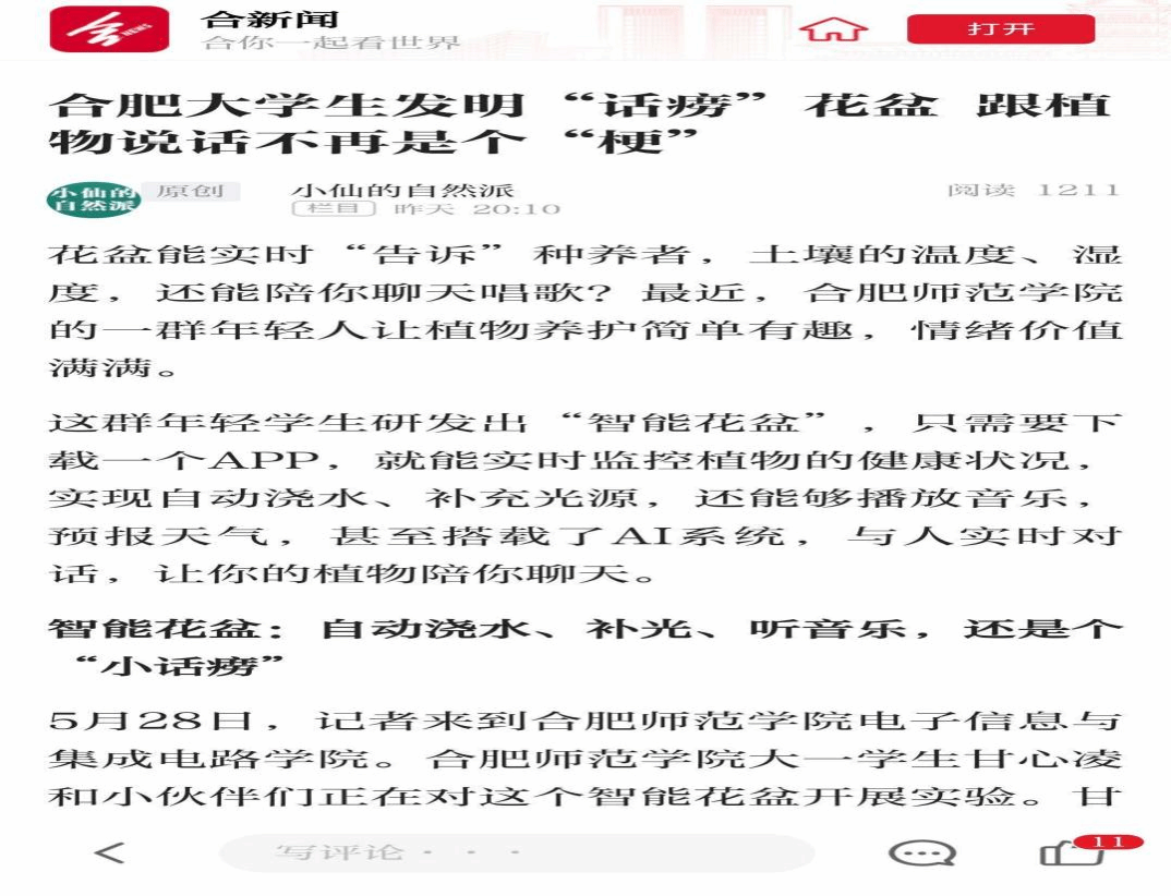 (本报讯)近日,世俱杯sjb官网学生团队研发的“植慧联萌——基于物联网的智能花盆系统与AI植物健康管家”项目获得《合肥晚报》专题报道,展现了我校学子的创新活力与专业素养。