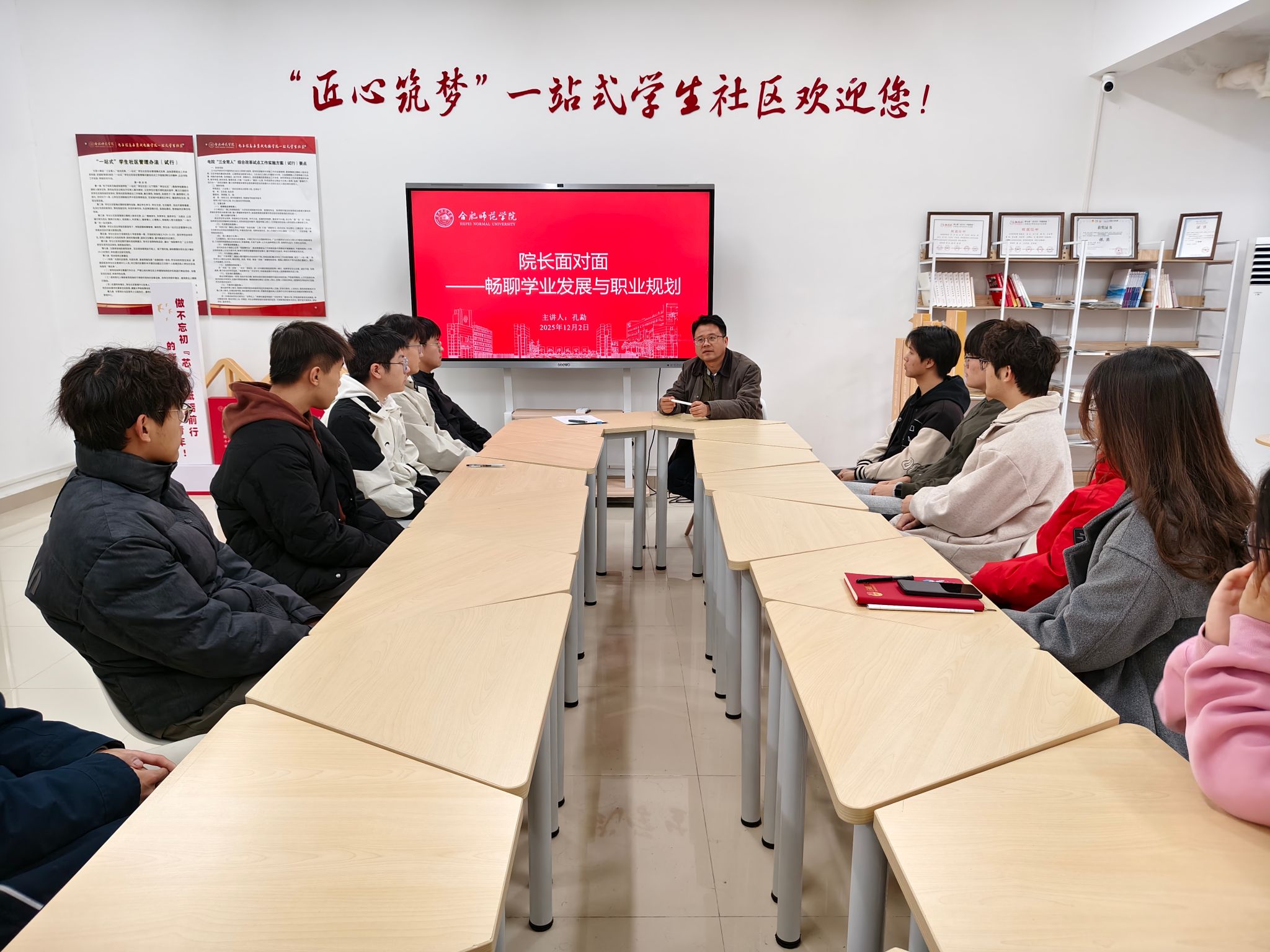 为精准回应学生在学业深造、职业选择上的普遍关切,世俱杯sjb官网于12月2日在“匠心筑梦”一站式学生社区举办“院长面对面”专题活动。学院副院长孔勐教授与2023级学生代表围坐交流,聚焦专业发展与个人规划,展开了一场务实而深入的对话,将育人力量直接延伸到学生生活的最小单元。