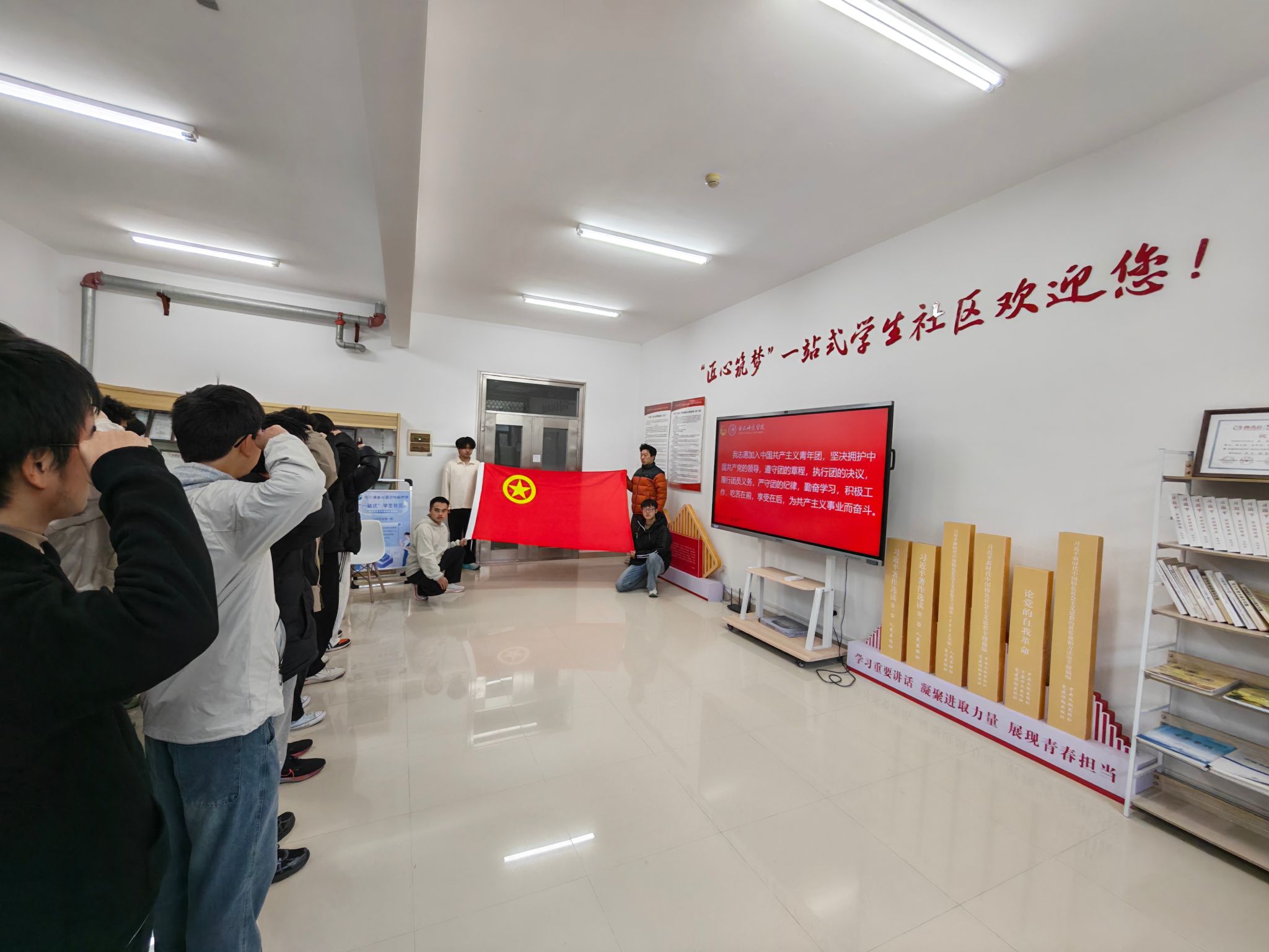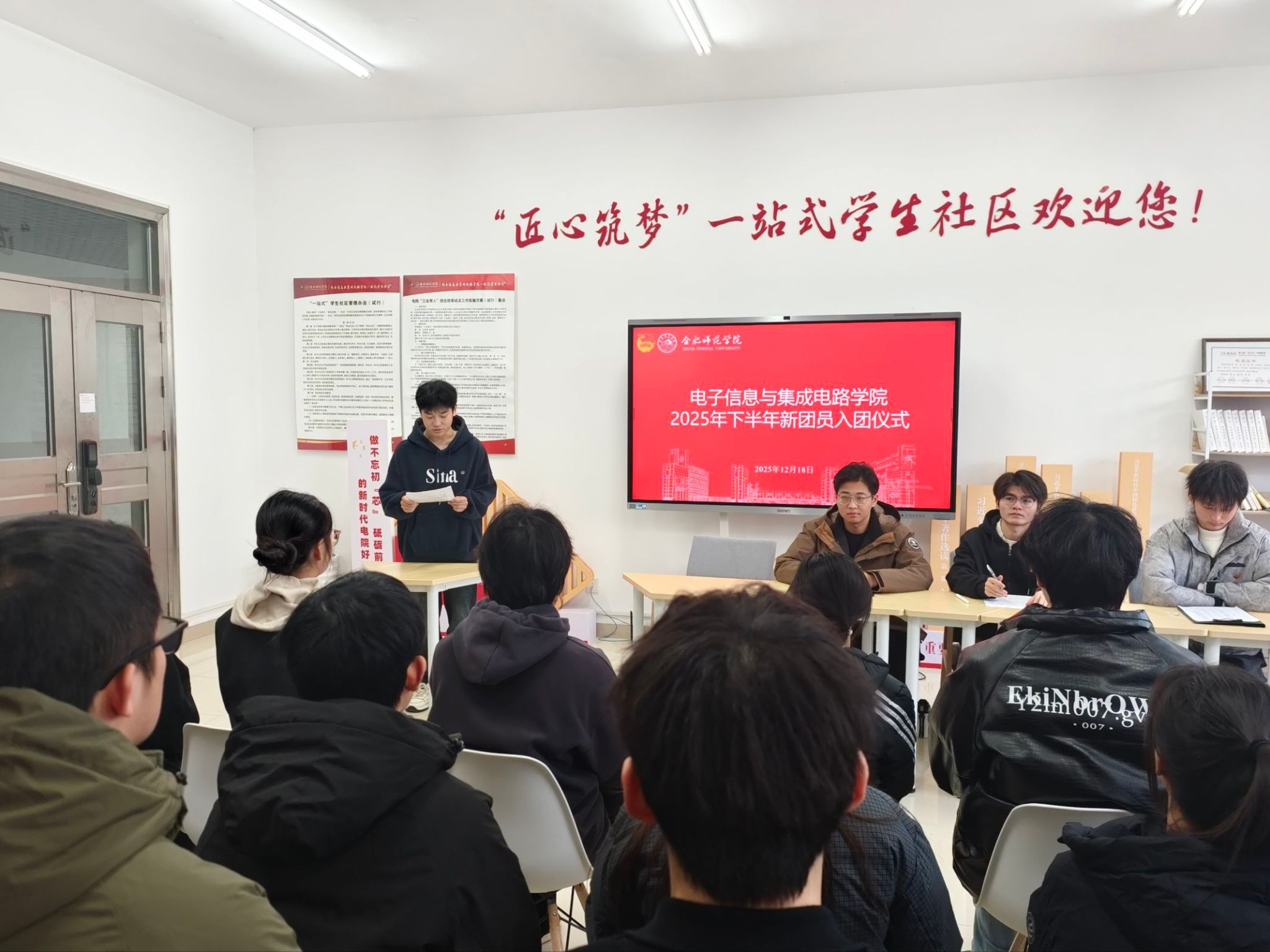 为加强青年思想政治引领,规范团员发展工作,12月18日,世俱杯sjb官网在“匠心筑梦”一站式学生社区举行2025年下半年新团员入团仪式。学院团委学生会指导老师马文斌及42名新发展团员参加仪式。