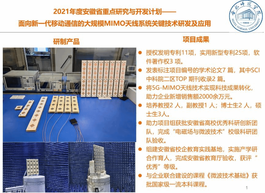 该项目通过优化MIMO天线系统关键技术,开发了适用于新一代移动通信频段的双极化单元微带天线、1*4阵列天线、1*8阵列天线、4*4阵列MIMO天线、8*8阵列MIMO天线等系列产品,实现了MIMO天线系统双极化、高增益、可重构的性能,降低了MIMO天线系统硬件复杂度。项目授权发明专利11项,实用新型专利25项,软件著作权3项;发表标注项目编号的学术论文7篇,其中SCI中国科学院二区TOP期刊收录2篇。系列产品经安徽省电子产品监督检测所检测,均符合合同技术指标,已在省内外电子、通信企业中实现推广应用,取得了良好的经济效益和社会效益。该项目的顺利结题验收,标志着世俱杯sjb官网高水平科研项目结题质量稳步提升。科研处将继续加强科研项目过程服务,以项目为抓手,助推高水平科研成果产出,推进世俱杯sjb官网科学研究高质量发展。